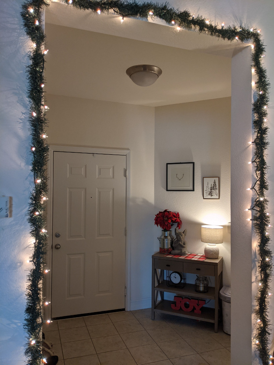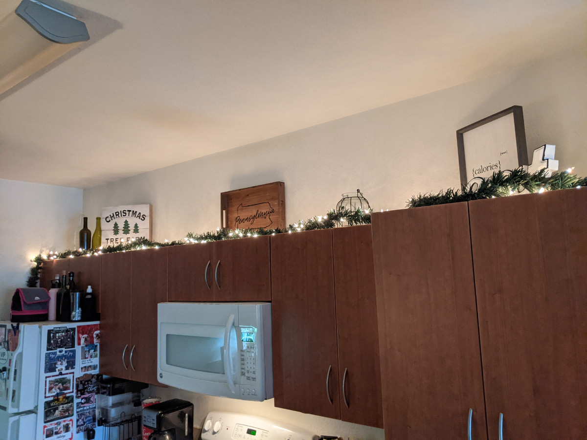 The first step to making a cozy holiday wonderland was to decorate the apartment! The tradition we have started the last couple of years was to put all the decorations up the night of/the day after Thanksgiving. However, with how 2020 was going this year, everyone in the apartment agreed that putting up the Christmas decorations early was necessary for all of our own sanities. I do not have quite the collection my Mom and Grandma have for Christmas. However, I try to have as many cozy accessories as possible. White lightened garland is hung around the doorframe that enters into our apartment entryway. Christmas blankets and pillows are thrown and tucked in nicely onto the couch and chairs. Another strand of garland rests on the tops of our kitchen cabinets, giving off a light whimsical glow in the evening hours. In our bedroom, I throw on the Christmas linens to make the room feel extra cozy. Luna absolutely loves our Christmas throw. It is a red and black buffalo plaid with white Sherpa lining on the inside. Her favorite place to curl up and take a nap is always on the bed during the Winter season. I also have white lightened garland draped across the bedframe backboard and a medium-size Christmas tree placed in the corner of the room. This Christmas tree is decorated with white lights, wooded snowflakes, and buffalo plaid bulbs to give off a country Christmas cabin feel to the room. During this time of the year, it isn't hard for any of us to doze off into a deep sleep in there.